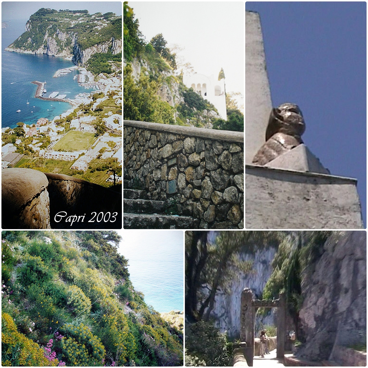 Sajnos ezen a 2012-ben történt utazásunkkor idő hiányában nem kerültünk közelebbi kapcsolatba a Föníciai lépcsővel, ezért egy montázs erejéig kölcsön vettem a régi, 2003-as képeimet Capriról. Az, hogy Axel Munthe villája a tenger felé néz, bizonyára nem a véletlen műve, és így a szfinx is egészen jól látszik. A májusi hegyoldal virágözöne és a villa felé vezető szép útrészlet már csak ráadás a régi emlékekből! :-)